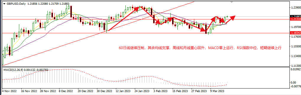 天图上,所有均线继续支撑,周线月线重心回升,MACD零上运行,RSI指数中高位。今日操作策略高空为主,1.2290-1.2280入场,止盈1.2150,止损1.2420。